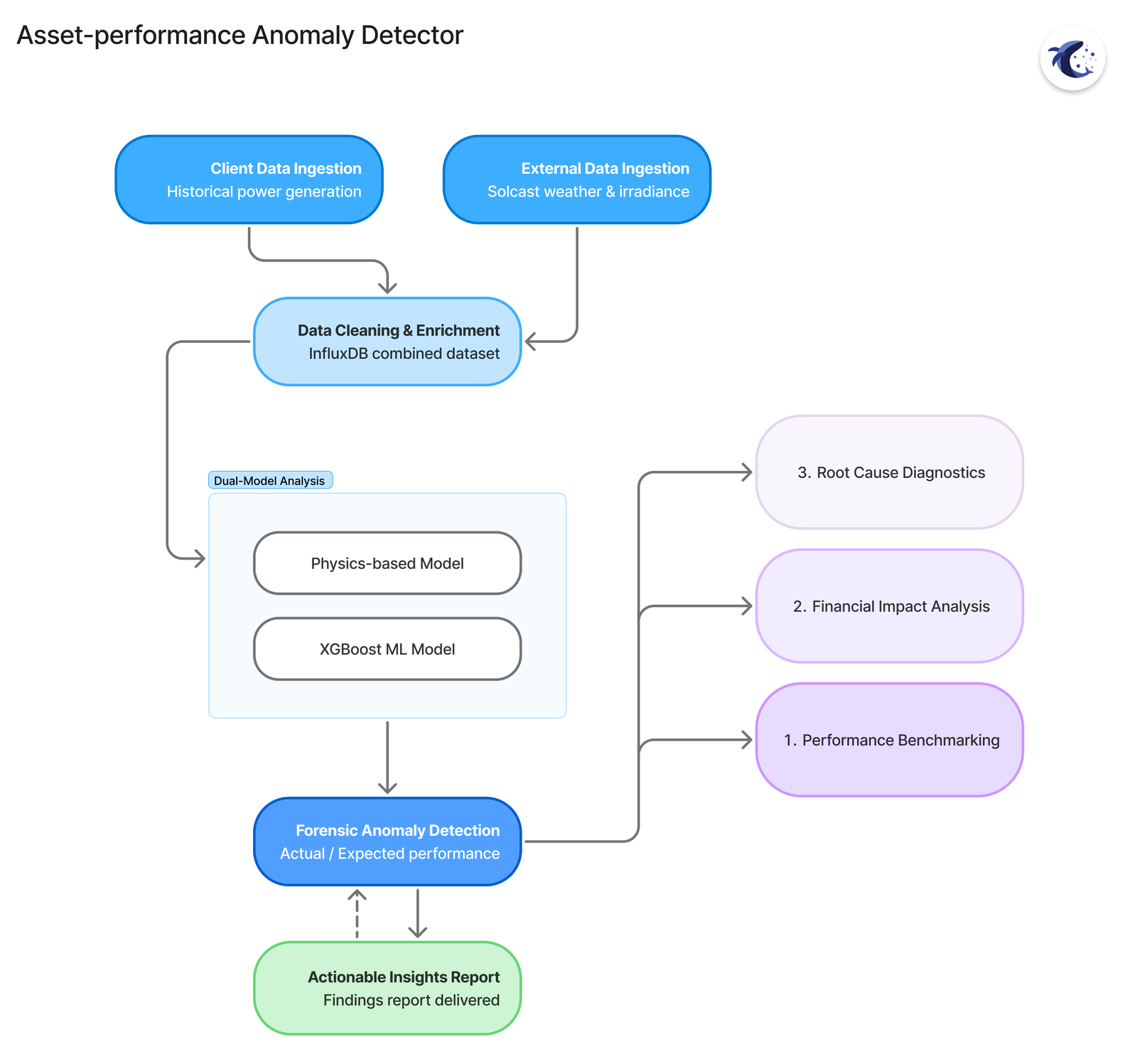 A physics-based model calculates your asset’s theoretical maximum output based on its specific hardware (panels, inverters) and high-fidelity meteorological data providing a performance benchmark. Simultaneously, a machine learning model (XGBoost) learns the asset’s unique, real-world performance signature from its own historical performance data, generating a high resolution, bespoke predictive model.